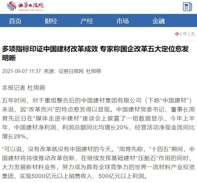 中国建材党委书记、董事长周育先接受采访时提到的中国建材因改革而生、因改革而兴。积极推进资产证券化,管好股权,使中国建材建立起“定位清晰、生态优化、机制有效”的国有资本投资管理体系;完善治理机制、发挥非国有股东作用,推动混改走深走实,利用市场化改革激发企业新活力,利用创新驱动引领集团科技发展。