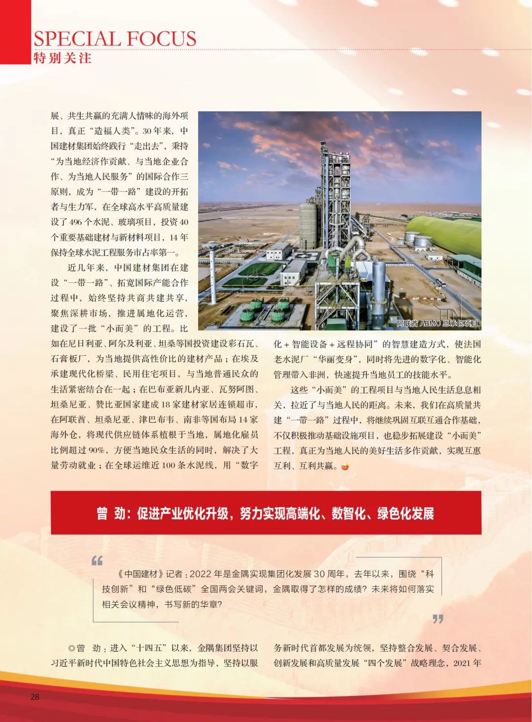 秉承“材料创造美好世界”的企业使命,围绕“四个面向”,充分发挥科技创新“国家队”作用,加快打造原创技术策源地和无机非金属材料国家战略中坚力量,聚焦基础建材低碳发展和新材料领域的“卡脖子”技术、前沿技术,加强基础研究和应用基础研究,加大研发投入力度和创新资源集聚,努力成为原始创新和核心技术的需求提出者、创新组织者、技术供给者、市场应用者。积极鼓励“揭榜挂帅”,为科技英才提供创新“竞技场”,加强知识产权的保护和运用,把集团内外创新力量拧成一股绳,形成高水平科技自立自强的强大合力。强化科技创新体制机制建设,完善科技人才培养、评价、激励制度,让科研人员安心搞科研,让各类人才尽展其能,有效激发创新创造活力。 周育先:中国建材国企改革三年行动完成率已达93%,并初步构建国有资本产业投资模式 总体来说中国建材的国企改革三年行动进展顺利,很多台账任务在去年已经完成,截至2021年底,完成率达到93%,并初步构建出定位清晰、生态优化、机制有效的国有资本产业投资模式。具体来讲有:一是主动自发完成“规定动作”。集团总部建立覆盖全级次企业的改革推进信息系统,以穿透管控带动全级次有实质经营的1100余家成员企业实现改革工作“齐步走”,并自我加压、提高完成标准,董事会应建尽建、外部董事占多数、经理层成员任期制和契约化管理等“规定动作”均在2021年实现100%完成。二是结合实际开展“自选动作”。针对混合所有制企业占比高的特点,探索开展相对控股混合所有制企业差异化管控、发挥非公股东作用等改革举措,推进国有资本与民营资本协同发展,同时建立了5类8种中长期激励“工具箱”,将科研、管理、技术骨干人员与企业中长期发展形成利益绑定,2021年超过2300名骨干人员实施了多种中长期激励工具。三是构建改革赋能发展的长效机制。通过修订公司章程、完善三会议事规则、出台配套操作指引、建立信息系统实施闭环监测等措施,将党的领导融入公司治理、董事会规范运作、经理层成员有效行权、混合所有制企业差异化授权、非公股东发挥作用、三项制度改革等一揽子改革“组合拳”嵌入到各级企业的管理体系之中,构建通过改革提升效率与活力的长效机制。 2022年是国企改革三年行动的“收官年”“决胜年”。我相信中国建材肯定能交出一份满意答卷,我们也在以下三个方面持续推进,确保完成任务。一是按时完成国企改革三年行动各项任务。中国建材将于6月30日前全面完成改革任务台账,并按照“可衡量、可检验、可考核、要办事”的标准做好各项改革措施落实落地,确保高质量完成。二是总结经验,深化改革。中国建材将认真总结改革三年行动的各方面经验,锚定企业发展战略,将改革与经营发展深度融合,使改革成果继续影响和推动企业高质量经营再上台阶。三是继续探索和推进企业高质量发展。改革始终是中国建材的“内在基因”。随着国企改革三年行动的全面完成,中国建材将继续深入思考“国之大材”的国家需求与“材料创造美好世界”的企业使命之间的完美融合,以服务国防建设、服务国家重大工程、服务国民经济主战场和服务人民美好生活为目标,以“问题导向、目标导向、结果导向”为原则继续推进改革,建成更具竞争力、更有创新力、更强抗风险能力的体制机制,促进加快建成世界一流材料产业投资公司。我相信,今年央企完成国企改革三年行动后,对国有经济的布局优化和结构调整,对国有资产的有效监管,对产业链供应链的支撑和带动能力都会有明显提升。 周育先:要建设更多共生共赢、充满人情味的海外项目 “小而美”工程,真正体现了习近平总书记心系“一带一路”沿线人民生活,体现了中国共建命运共同体,希望世界人民共同富裕,共同幸福的美好心愿。日韩无码