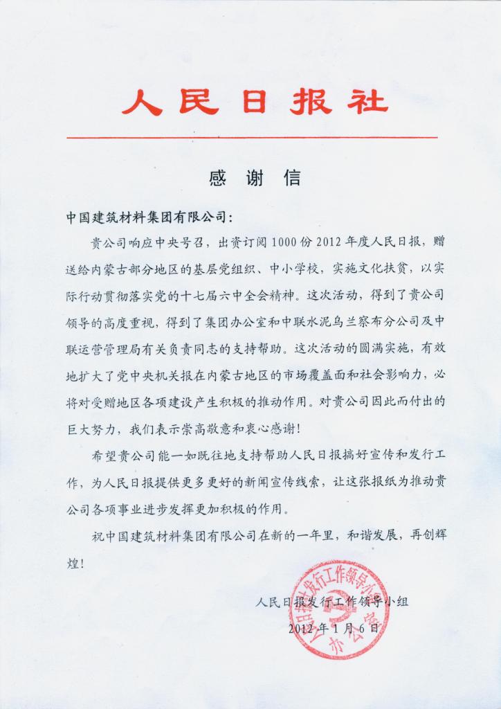 人民日报社致集团公司的感谢信