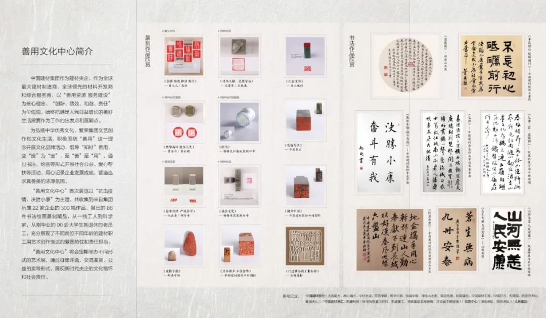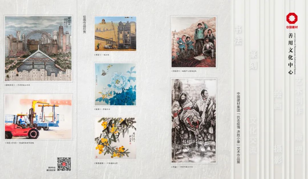“善用文化中心”首次展览以“抗击疫情 决胜小康”为主题,共收集到来自集团22家企业的300幅作品,展出的86件书法绘画篆刻精品,从一线工人到科学家,从刚毕业的90后大学生到退休的老员工,充分展现了不同岗位不同年龄的建材人用艺术创作表达的爱国热忱和责任担当。