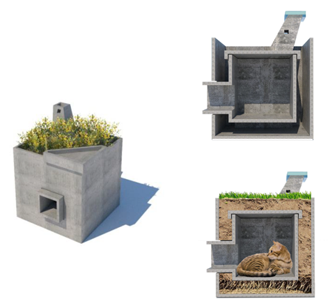 喵坞最初来自于“猫宅计划——流浪猫窝设计征集”活动。整体采用中国建材总院研发的水泥基材料打印建造而成,创新性地对喵坞的整体结构进行了配筋,使打印的喵坞结实耐用,抗开裂能力强,具有很好的韧性,实现了水泥基材料与钢筋的完美结合,是当前最新3D打印科技、特种新材料和兼容并包文化的有机结合体。
