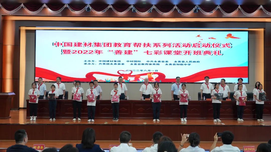 中国建材股份副总裁、中材国际党委书记、董事长刘燕,集团团委书记杨希,中材国际、中材科技等有关领导,集团派驻五个定点扶贫县挂职副县长乜也、赵柯、杨璞、杨建强、罗小文,定点扶贫县委相关领导,全体志愿者、学生和家长代表等参加了各县的七彩课堂启动仪式。
