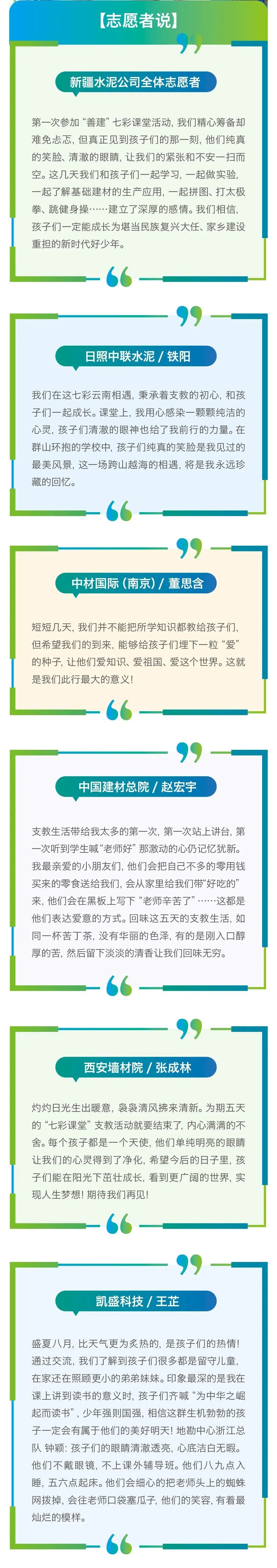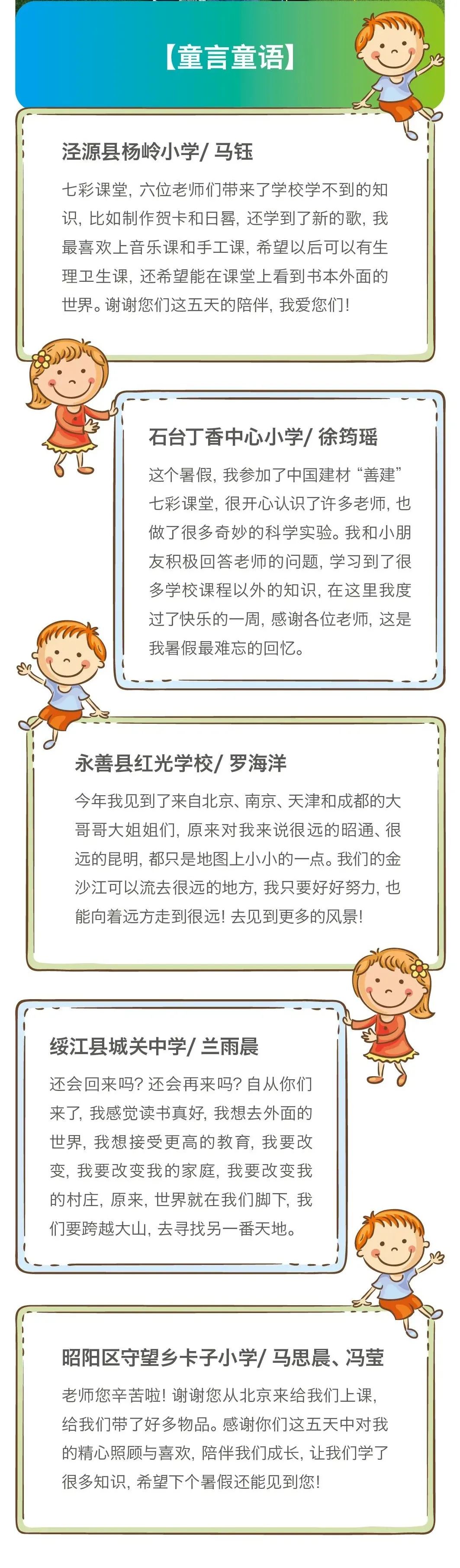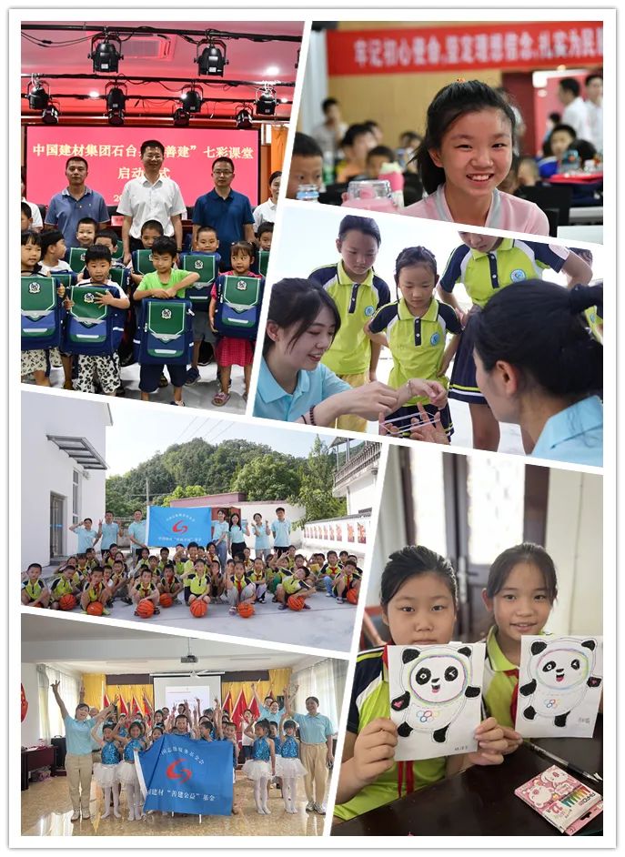 此次“善建”七彩课堂在5个定点帮扶区县设置了15个教学点,覆盖740余名学生。课程设置自然科学、文艺体育、人文历史等内容,还有体现建材特色的各种企业课,革命传统教育要从娃娃抓起的党史教育课,既增长知识、拓展思维,又磨炼意志、强健体魄。五天七彩课堂,精彩纷呈、有趣有料,为孩子撑起一片健康成长的天空,将新时代的强音传递到孩子的心坎上,将强国的志向植根在孩子的心田里。