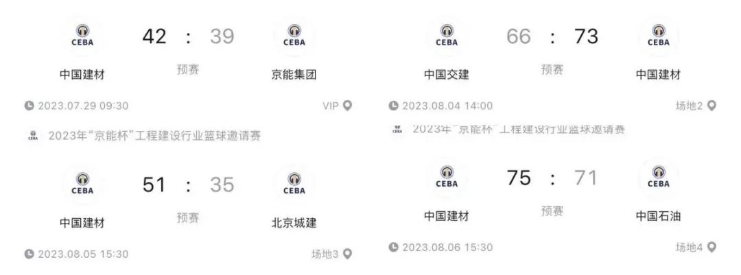 经过激烈角逐,中国建材先后战胜京能集团、中国交建、北京城建、中国石油,获得四连胜,以B组第一的名次进入前八强。