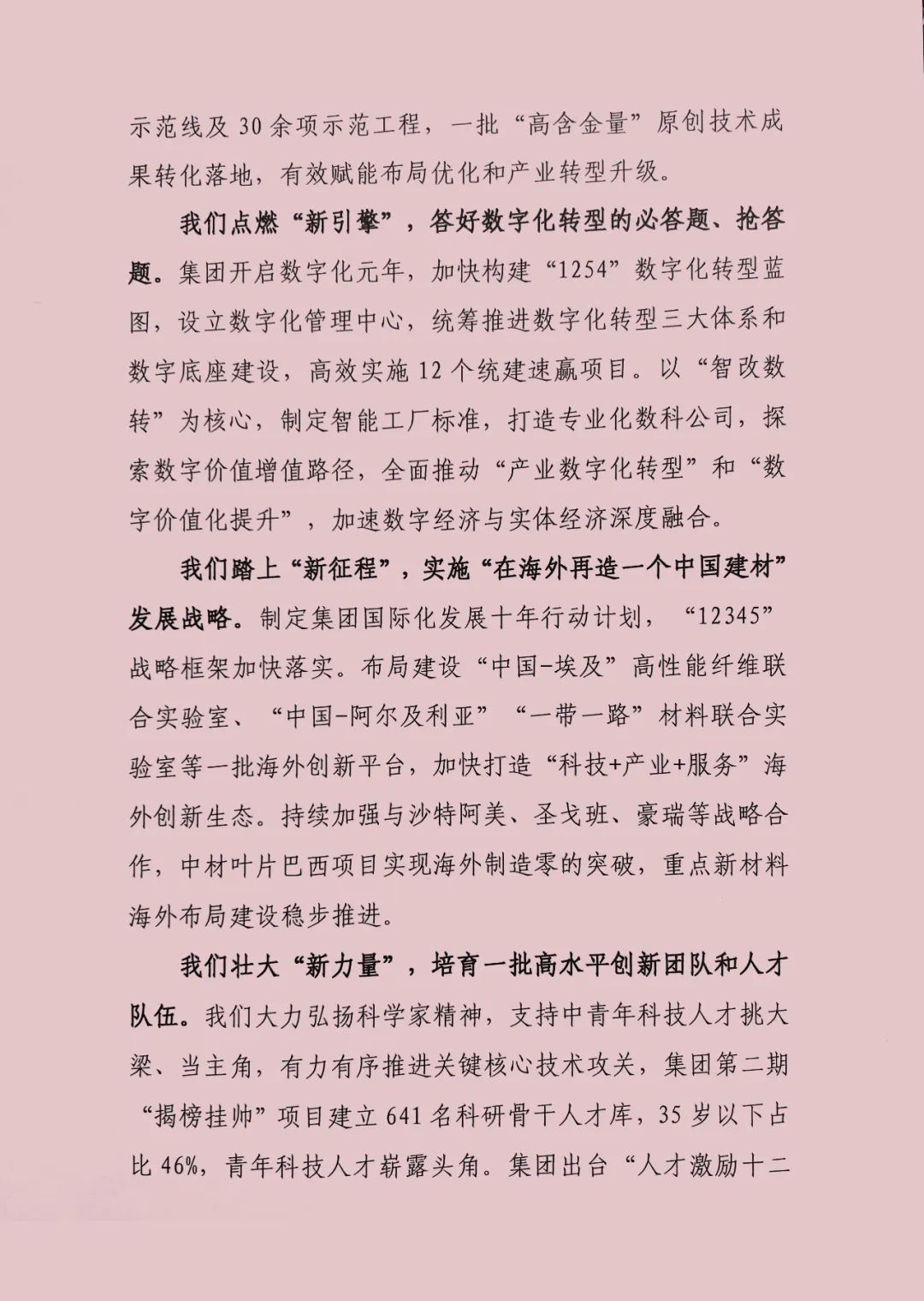 我们踏上“新征程”,实施“在海外再造一个中国建材”发展战略。制定集团国际化发展十年行动计划,“12345”战略框架加快落实。布局建设“中国-埃及”高性能纤维联合实验室、“中国-阿尔及利亚”“一带一路”材料联合实验室等一批海外创新平台,加快打造“科技+产业+服务”海外创新生态。持续加强与沙特阿美、圣戈班、豪瑞等战略合作,中材叶片巴西项目实现海外制造零的突破,重点新材料海外布局建设稳步推进。