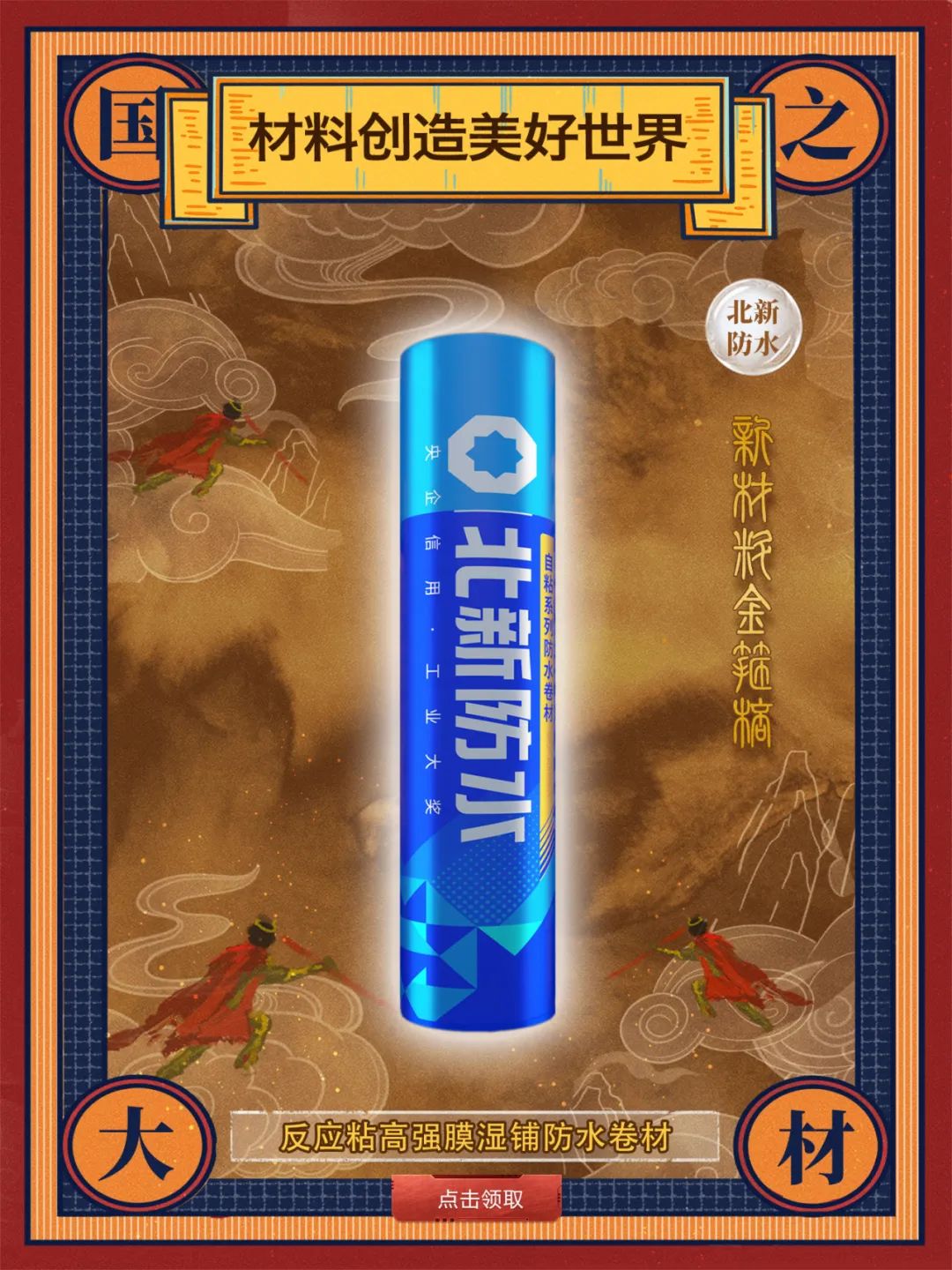 北新防水反应粘高强膜湿铺防水卷材是以高分子高强膜为表层或胎基增强层,双面涂覆反应型改性沥青自粘胶,并覆以隔离材料制成的防水卷材。该产品在自粘胶中添加了独有的活性剂、浸水剂等,在保持传统自粘橡胶优点的基础上,增加了胶质的蠕变性,使其渗入到混凝土的孔隙和毛细管中,形成物理吸附和卯榫作用,同时混凝土与水泥凝胶发生化学反应,形成化学交联结构,使卷材与基层牢固粘结,形成密闭,密封防水层。