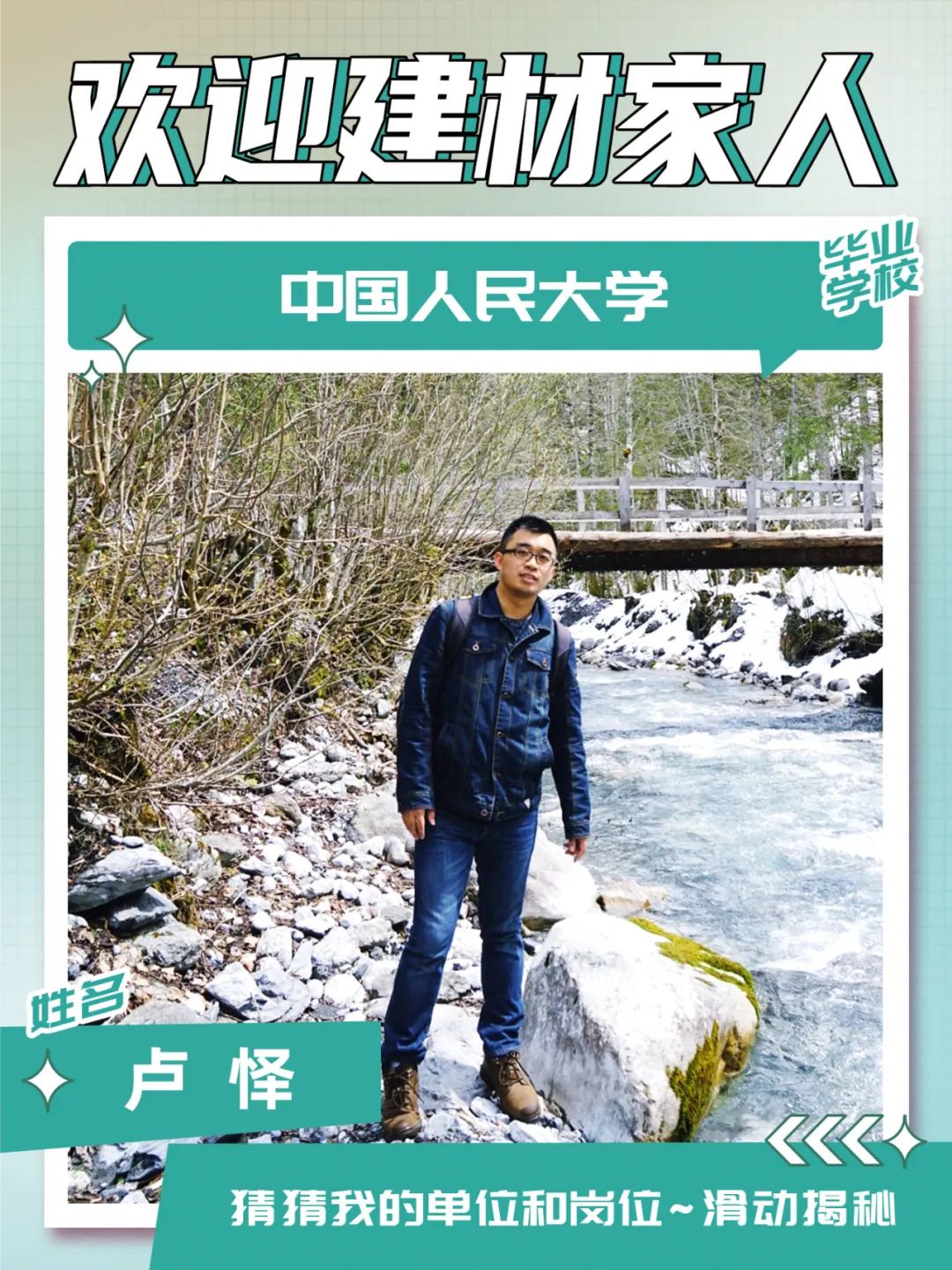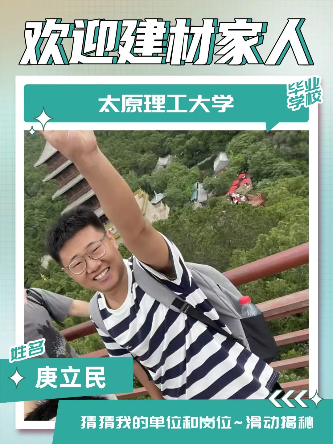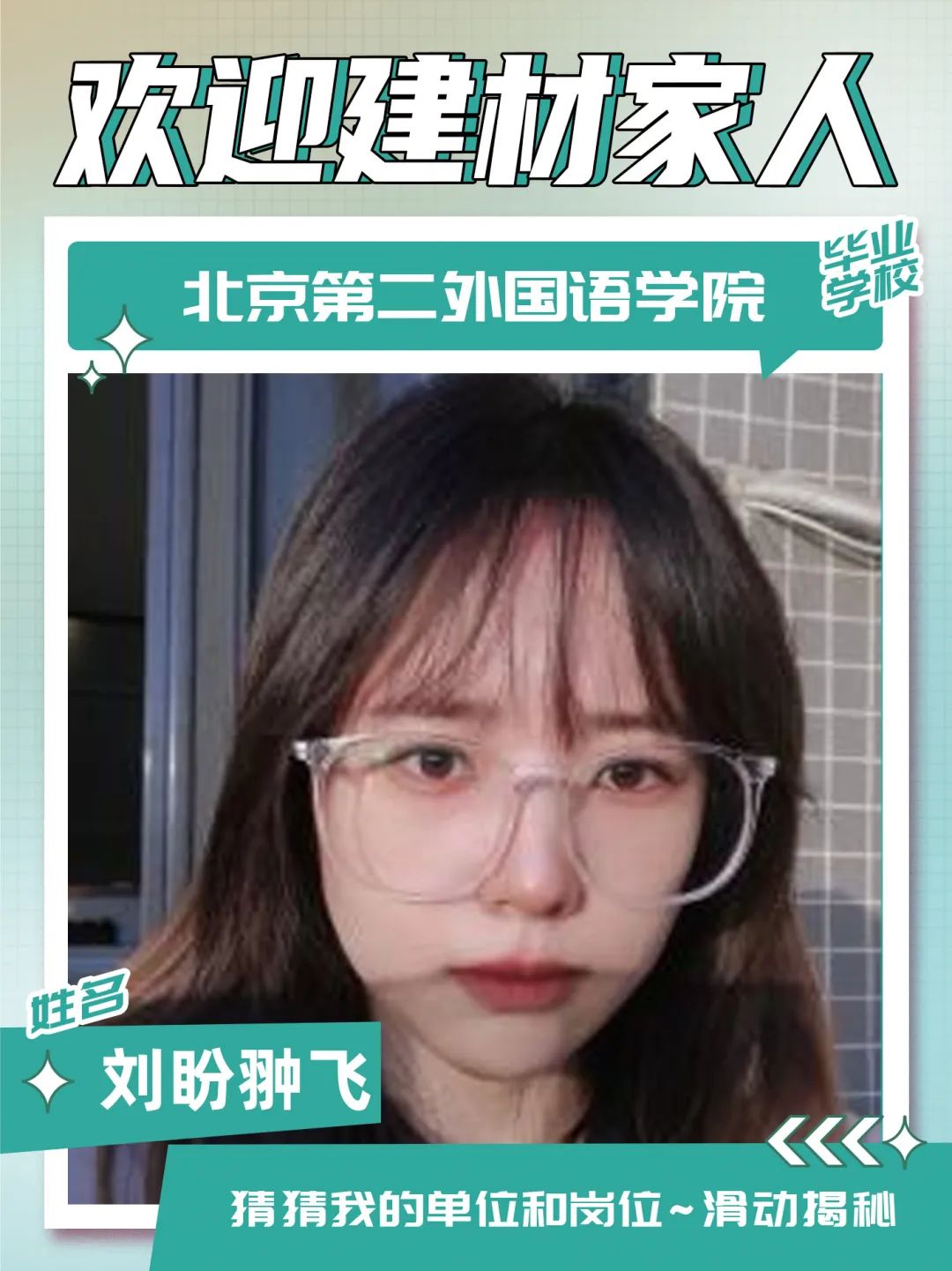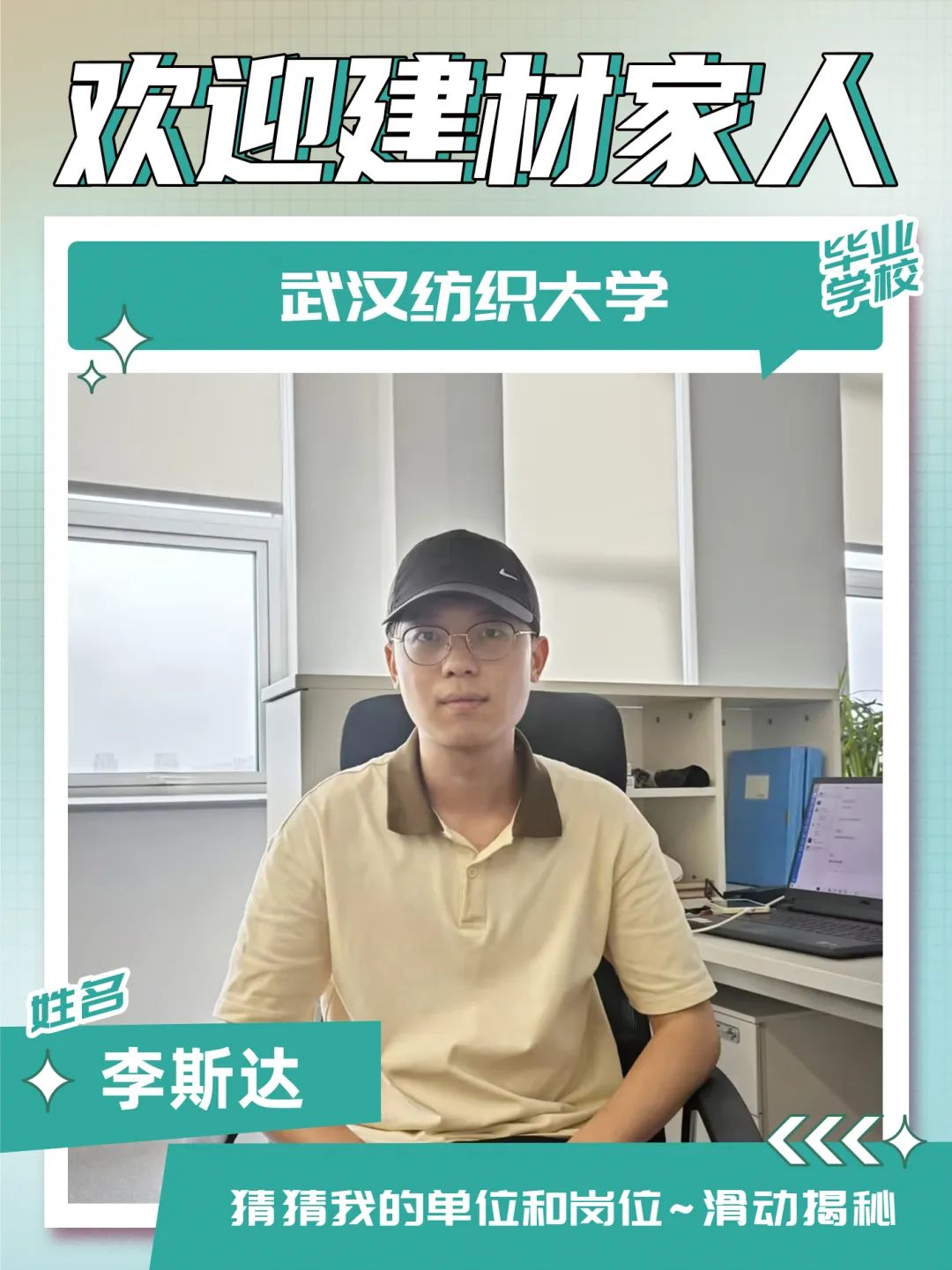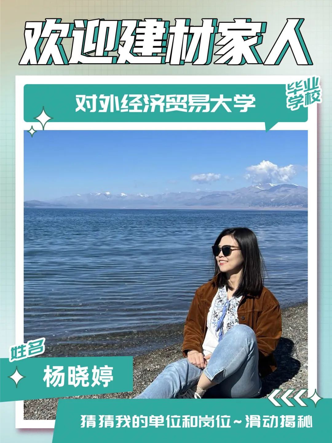 入职感言:我性格开朗,做事认真,有责任心,喜欢运动、健身在接下来的工作中,我会以热情、认真的态度对待工作,踏实做好每一件事,不断加强学习,提升专业技能,虚心向前辈请教,努力为中建材投资这个大家庭贡献自己的力量!未来可期