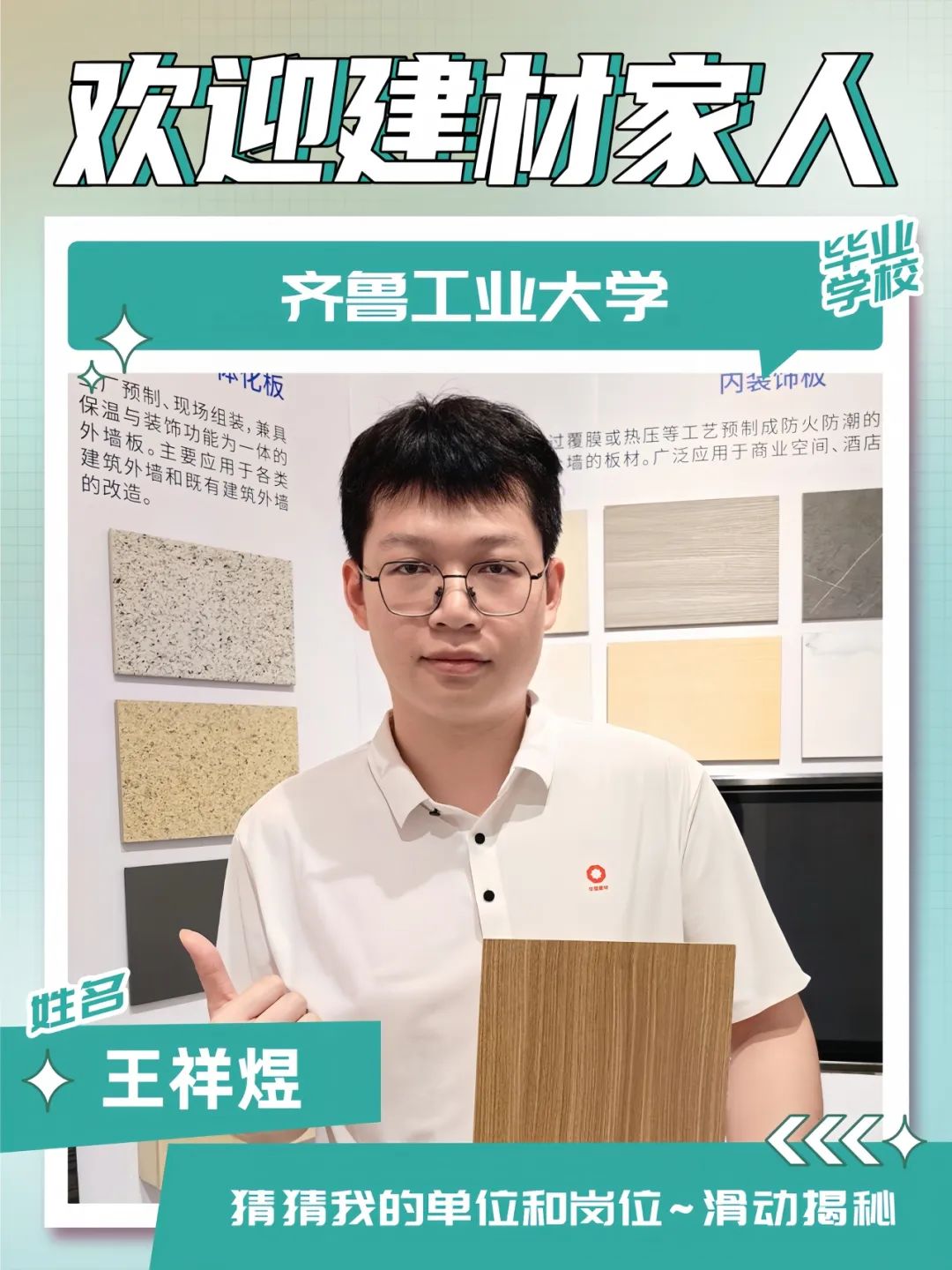 入职感言:心怀梦想,砥砺前行。从一名材料科学与工程专业的研究生到成为中材节能(武汉)有限公司硅酸钙板事业部材料研发助理工程师,能在学习与实践中积累行业经验,在“材料创造美好世界”的企业使命中成就自己的价值,我感到无比自豪。