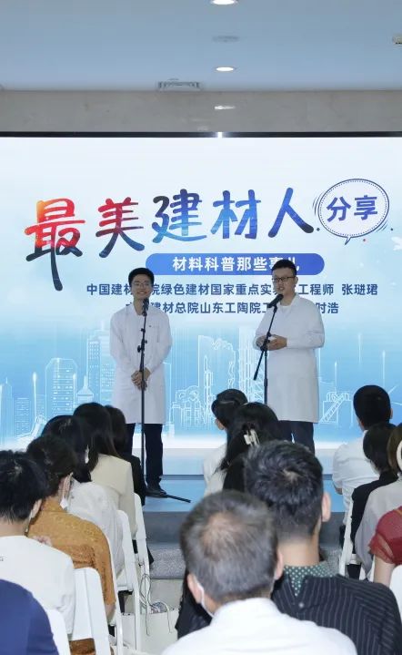 本届启动仪式特别邀请最美建材人的代表进行现场分享,全国劳动模范、天津水泥院数字化研究所所长胡亚东讲述了“走出舒适区,才能突破自我”的智能化历程,人工晶体研究院副总经理訾蓬讲述了科技成果转化探索的故事,受到参与人员一致好评。90后最美建材人代表张琎珺、刘时浩以生动有趣的脱口秀形式分享他们的故事,展现一线的青年科技工作者爱国爱企、创新自强的责任与情怀。
