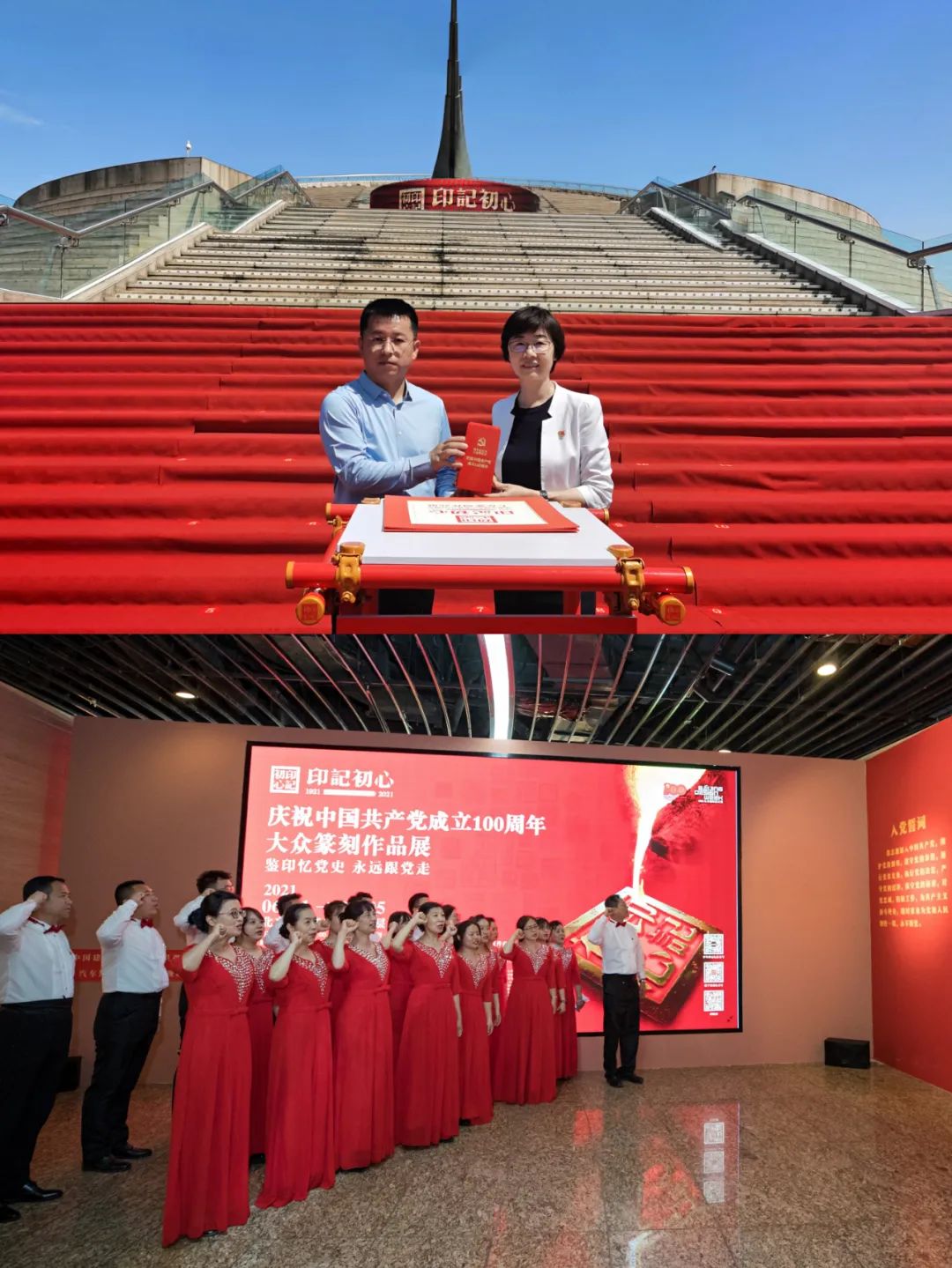 健跑前夕,孙力实向中华世纪坛赠送了新材料印章,广大党员参观中华世纪坛举办的“印记初心——庆祝中国共产党成立100周年大众篆刻作品展”,并开展重温入党誓词活动。