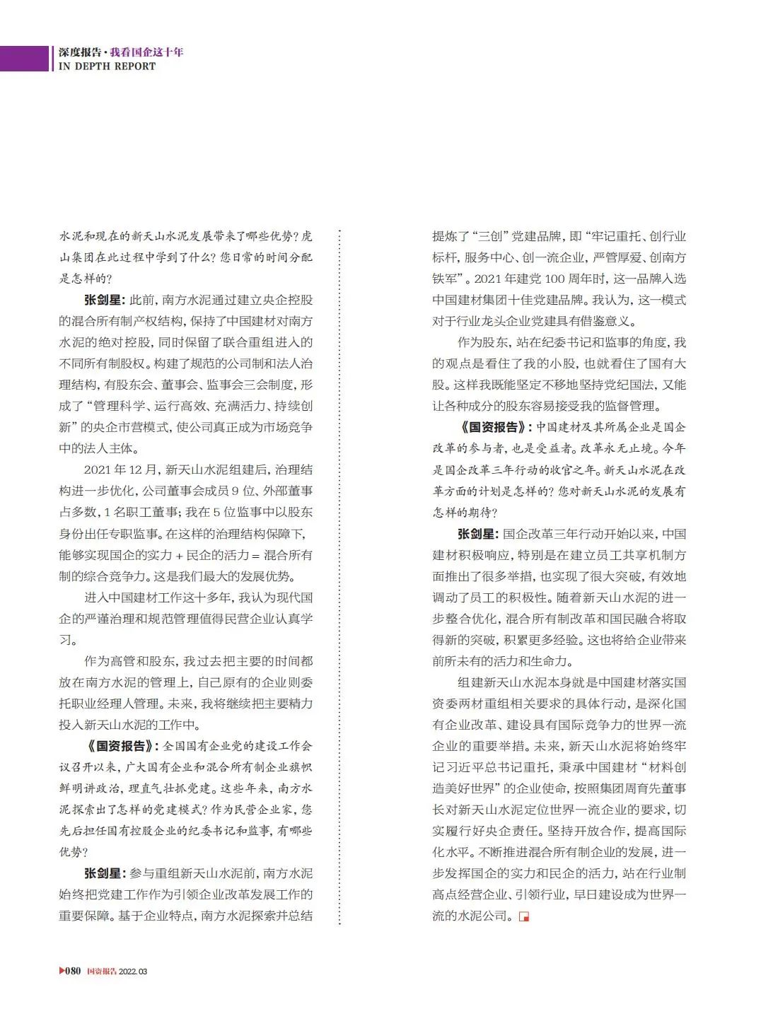 改革亲历者访谈 | 《国资报告》专访中国建材新天山水泥张剑星:“国”“民”牵手,皆大欢喜