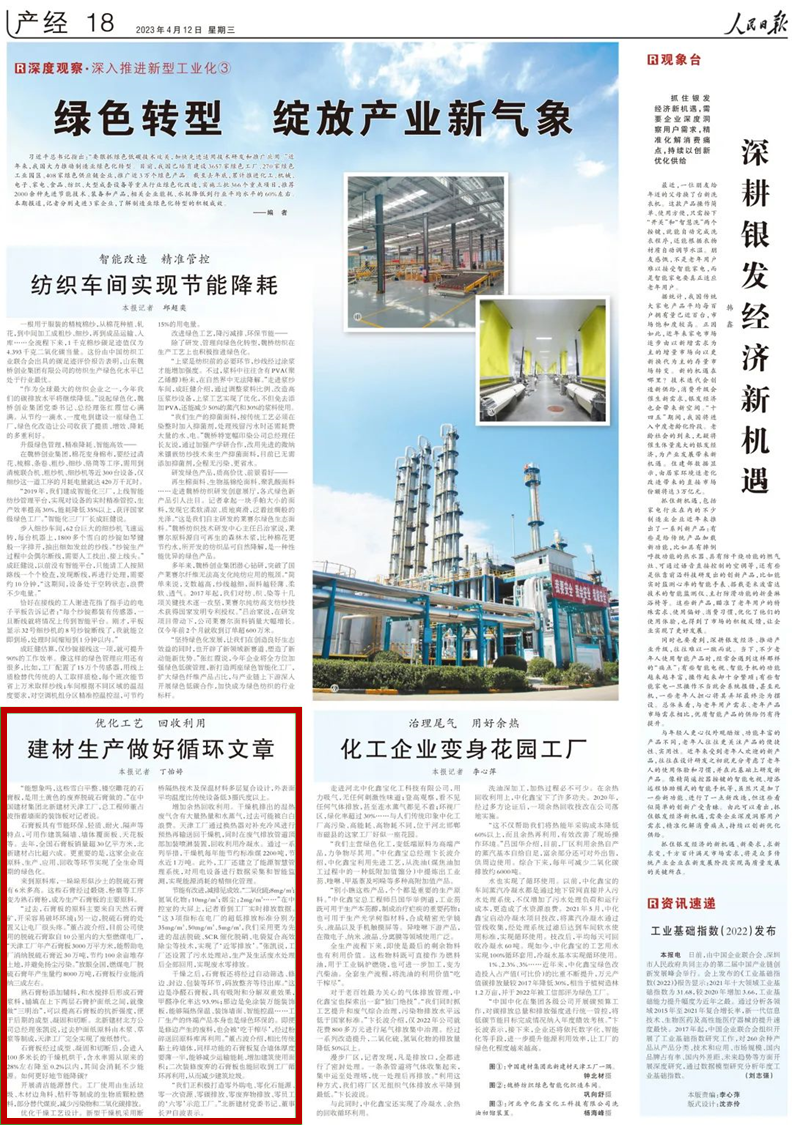 来源:人民日报、北新建材 发布时间:2023-04-134月12日,人民日报刊登文章《绿色转型 绽放产业新气象》,重点报道了北新建材天津工厂坚持绿色制造,通过实现工业固废循环利用、推行“近零排放”污染物治理技术等加快绿色发展实践。小料现将内容分享给大家。