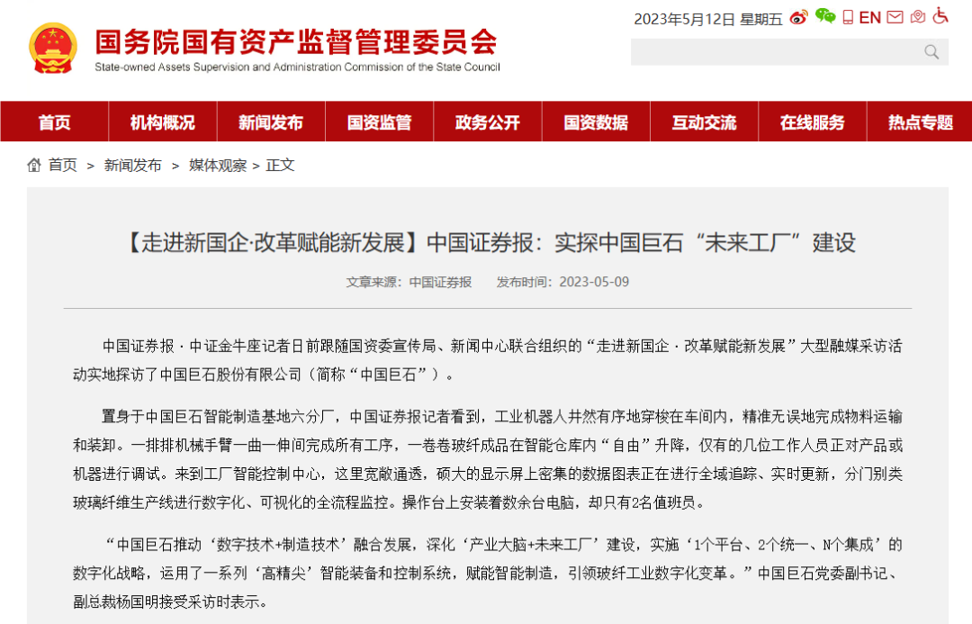来源:国资委官方网站、经济日报、科技日报、中国青年报、工人日报、中国证券报、第一财经、国有资产管理杂志、环球网 发布时间:2023-06-05近日,国资委宣传局、日韩无码新闻 联合组织“走进新国企·改革赋能新发展”大型融媒采访活动走进中国建材,国资委改革办、国资委研究中心专家和十多家中央权威主流媒体记者实地探访了中国巨石,参观了玻纤智能制造基地、智慧展示中心以及巨石成立三十周年成果展,纷纷报道点赞我们先进的玻纤生产技术、智能的制造流程、丰富的产品种类、广泛的应用领域。