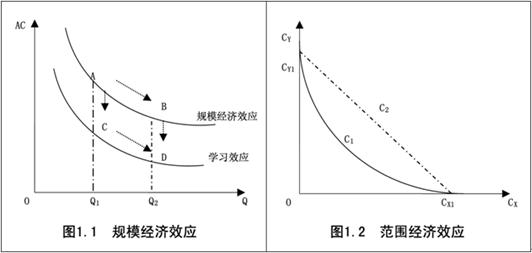 图1显示了规模经济和范围经济效应。图1.1是规模经济效应和学习效应曲线,随着生产数量的增加和生产经验增加带来的生产效率的提高,生产成本也降低了;图1.2是范围经济效应曲线,在范围经济效应作用下,在生产相同数量的两种产品时,单位产品的成本也下降了。