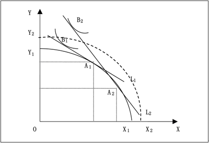 图3是贸易提高一国福利水平的理论图解。曲线X1Y1是生产可能性边界线,横轴代表产品X的产量和消费量,纵轴代表产品Y的产量和消费量;L1和L2线分别代表无贸易时和有贸易时的产品价格比例,也被称为等价值线,代表了一国消费者的消费能力;B1和B2线是消费者福利水平的无差异曲线,B2的福利水平高于B1.该图代表的是一个在生产X产品上具有比较优势的国家。在开放之前,该国的生产点在A1,能够实现的福利水平是B1;对外开放融入全球化进程之后,该国可以通过多生产X出口,换取更多的产品Y,达到更高的无差异曲线B2.根据比较优势理论,与该国进行贸易的国家,则通过多生产产品Y,实现了福利水平的提高。因此,对于双方来说,X产量和Y产量都增加了,世界总产出提高了,而这只是因为各国都开放和相互贸易了。图中的虚线X2Y2是扩展了的生产可能性边界线。因为资本流入、技术进步等原因,使得生产效率提高了,一国的生产能力就会提高,实现产出扩大和经济增长。
