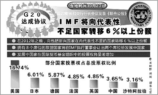 4.对全球经济治理的影响。发达国家之间、发展中国家之间、发达国家和发展中国家之间,都在经济全球化进程中更加紧密地联系在了一起。广大发展中国家获得了更多的发展机遇。以金砖国家为代表的一批新兴经济体国家经济实力迅速增强,国际经济格局发生了深刻的变动。全球经济治理机制,必须更多地反映新兴经济体和广大发展中国家的利益诉求。1995年,为在经济全球化形势下更好地管理全球贸易体系,世界贸易组织成立,取代了仅是条约性质的GATT;1998年,G7集团吸收俄罗斯成为G8集团;1999年,G20成立,并且其重要性不断上升。2010年10月,G20就国际货币基金组织份额改革达成协议,确认向新兴经济体转移超过6%投票权;同年11月,IMF执行董事会通过份额改革方案,见图4.根据该方案,IMF将向新兴经济体转移超过6%的份额,从而更好地体现该组织的合法性和有效性,美国、日本、“金砖四国”(中国、印度、俄罗斯、巴西)和4个欧洲国家(德国、法国、英国、意大利)将成为进入IMF份额前十位之列的经济体。中国、印度、俄罗斯和巴西“金砖四国”总共持有份额将升至14.18%,将分别位居第三、第八、第九和第十,而全体新兴经济体持有份额将升至42.29%。中国的份额将从目前的3.72%升至6.39%,投票权也将从目前的3.65%升至6.07%,超越德国、法国和英国位列第三,仅次于美国和日本之后。该改革方案需获得达70%份额会员国的批准才能生效。目前该改革方案正在等待成员国国内通过。截至2011年12月12日,有53国(持有份额相当IMF份额36%)已通过该议案。
