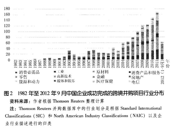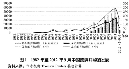 随着中国改革开放的不断推进和中国企业竞争力的不断增强,中国企业不断拓展国际化经营,对外直接投资规模不断扩大,中国企业通过跨境并购方式进行的对外直接投资也在不断发展。纵观中国企业的跨境并购,中国企业的跨境并购活动始于20世纪80年代,已经走过了30年的历程,从数量和规模上都取得了巨大发展,跨境并购成为中国企业迅速获取国外资源、市场和技术,积极开展国际化经营和发展的重要途径。本文从Thomson Reuters并购数据库中获取了1982年至2012年9月份所有被统计的中国企业跨境并购项目。Thomson Reuters下的Thomson One Banker数据库中记录了全球各国家或地区披露的并购项目(包括境内并购和跨境并购),详细地记录了目标企业、并购企业以及并购项目的各种信息,为我们研究中国企业跨境并购提供了翔实的资料。