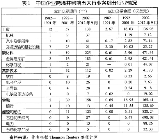 由图2可知,中国企业跨境并购早期行业比较分散,但从最近几年尤其是从2006年开始相对比较集中,主要是原材料、能源和动力、工业、金融和高新技术五大行业。从具体行业来看(见表1),中国企业在石油与天然气行业成功交易规模***,完成交易金额达698.08亿美元,共完成87起,其次是对金属与采矿行业企业并购,交易金额为424.41亿美元,共完成183起。中国企业在金融行业和高新技术行业的并购活动也较活跃,表现为完成的并购项目增加迅速,1992年至2001年期间,中国对工业、金融业和高新技术企业完成跨境并购分别为57起、39起和32起,而在2002年至2012年9月份期间,分别上升至138起、158起和112起。虽然并购项目增长迅速,但并购规模相对于原材料和能源类增长较为缓慢。