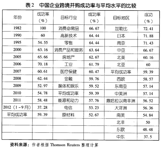 (一)中国企业跨境并购平均成功率较低,能源与动力、电信和原材料行业成功率低于平均成功率,欧洲、中南美洲、非洲地区成功率低于全地区平均成功率由于跨境并购会涉及母国和东道国的监管问题以及复杂的法律、公司财务、微观金融等,因此一项跨境并购项目的公开宣布并不意味着最终能够顺利完成,并购项目被公开宣布后在再估值和讨价还价过程中可能会被撤回或搁置,因此,一般公开宣布的并购项目数和披露金额会小于实际完成的数量和规模。表2显示,1982年至2012年9月中国企业成功完成的跨境并购项目数与宣布的项目数的比值为59.39%,意味着100起并购案中只有约59起会生效而最终完成交易,约41起并购会被撤回或搁置,中国企业跨境并购交易的成功率较低。中国企业跨境并购比较集中的行业如能源和动力、原材料并购成功率分别为57.76%和52.67%,比较集中的地区如欧洲和大洋洲的成功率也较低。尤其是在迅速发展阶段,从公布的并购项目与成功完成交易的并购项目在数量和金额上的差异可以看出,中国跨境并购项目在原材料和能源行业的并购项目上开始遭遇较大的阻力。