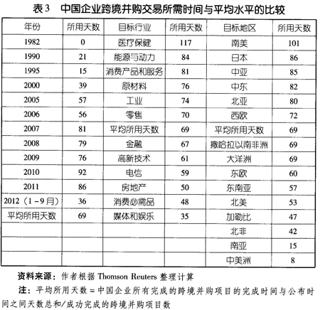 在交易完成前,买卖双方一般要支付一定的信息搜寻、谈判成本,以及法律、财务、金融等方面的服务成本,从公开宣布日期到完成交易的生效日期之间的长短在——定程度上可以反映一项跨境并购交易成本的大小。由表3可见,1982年至2012年9月中国企业跨境并购项目完成交易平均所用时间超过2个月,在一定程度上反映了中国企业跨境并购交易过程中交易效率较低,成本较高。由于行业敏感性和涉及金额较大,能源与动力行业平均所用时间为84天,原材料行业并购平均所用时间为76天,工业行业平均所用时间为74天。金融和高新技术行业效率比上述目标行业较低,分别为67天和61天。中国企业对南美国家的并购平均所用时间最长,超过100天,效率较低,其次是对日本企业的并购,对非洲、北美、东南亚和东欧企业并购耗时较短,效率较高。
